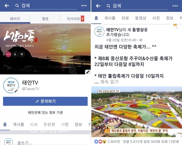 군은 최근 태안 튤립축제를 비롯해 군의 다양한 관광자원을 다룬 태안TV 페이스북 페이지 조회 수가 5월 2일 기준 13만 건을 기록하고 5천개가 넘는 댓글이 달리는 등 태안TV가 관내 관광자원을 소개하는 포털 역할을 수행하고 있다고 밝혔다.