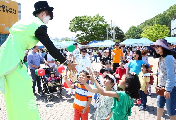 국립중앙과학관 광장에서 열린 ‘2017 유성 어린이 큰잔치’에서 키다리아저씨와 아이들이 즐거운 시간
