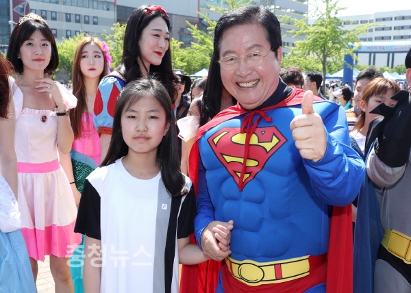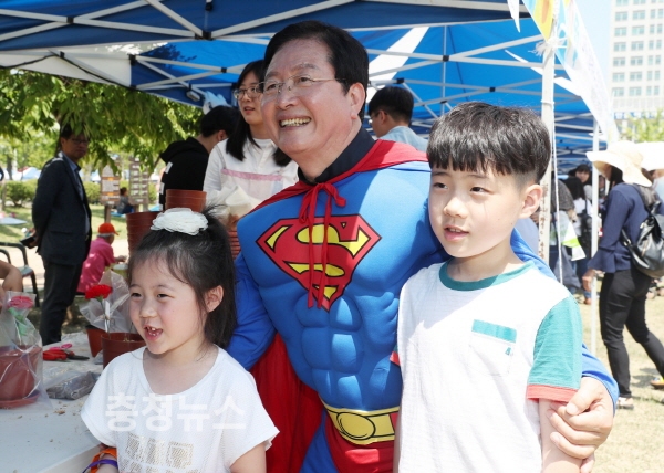 장종태 서구청장이 지난 5일 시청 남문광장에서 열린 ‘제95회 어린이날 큰 잔치’에 동심의 눈 높이에 맞춰 슈퍼맨 복장을 하고 참석해 어린이들에게 잊지 못할 추억을 선물했다.