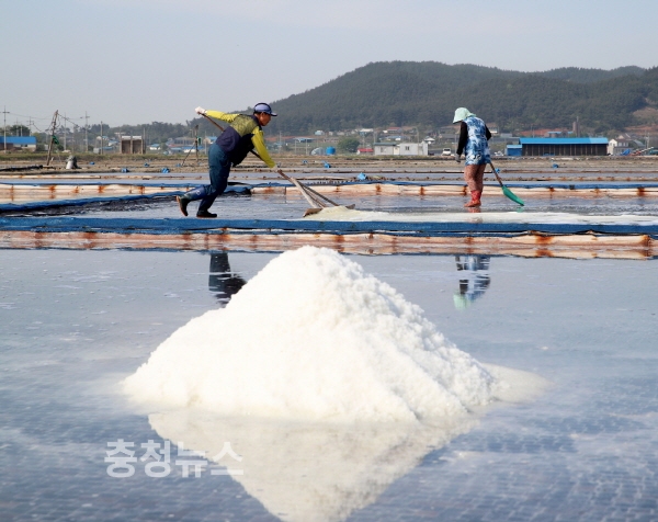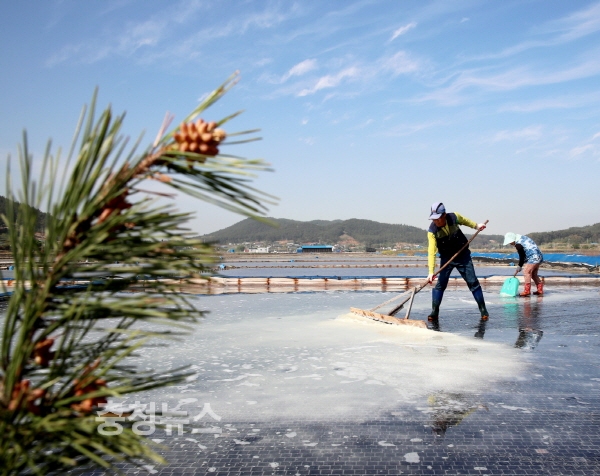 충남 태안군은 5월을 맞아 태안반도 곳곳의 천일염전에 송홧가루가 날려 와 쌓이면서 지역 특산품인 명품 송화소금이 본격적인 생산에 돌입했다.