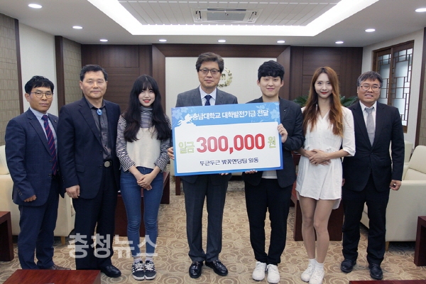 충남대 이용섭(경영학부 14학번), 조수진(행정학과 14학번), 김희중(무역학과 14학번), 안다정(스포츠과학과 15학번), 박지혜(우송대 글로벌조리학과 14학번) 학생은 10일 오덕성 총장을 방문해 30만원의 발전기금을 기부했다.