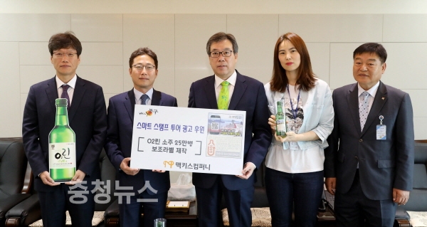 대전 동구(구청장 한현택)는 11일 구청 접견실에서 맥키스컴퍼니(회장 조웅래)와 ‘동구 명소탐방 스마트스탬프투어’의 대대적인 홍보를 위해 O2린 소주병에 부착되는 보조라벨 25만개 전달식을 가졌다.