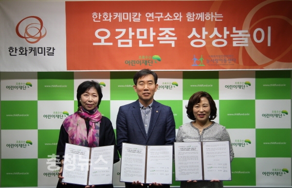 한화케미칼 중앙연구소(소장 이상욱)는 11일 서구 둔산동에 어린이재단 대전지역본부 회의실에서 한화케미칼 중앙연구소 연광흠 지원팀장, 늘사랑아동센터 김용숙 원장, 초록우산어린이재단 대전지역본부 박미애 본부장 및 관계자가 참석한 가운데 “오감만족 상상놀이” 업무협약식을 실시했다.
