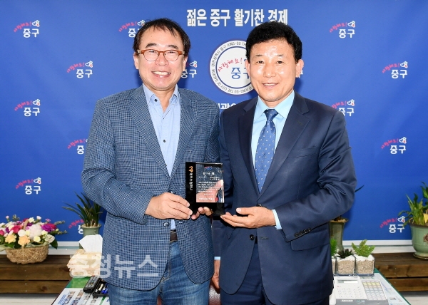 맥키스컴퍼니(옛 선양) 조웅래 회장은 지난 11일 대전광역시 중구청 청장실에서 박용갑 중구청장으로부터 감사패를 받았다.