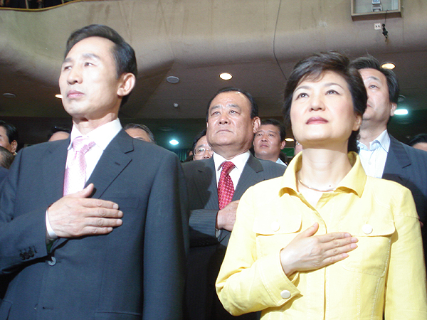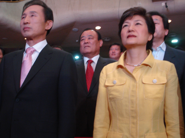 이날 행사에서 이명박 전시장은 '박정희 전 대통령이 쿠테타로 집권했을때 자본도 기술도 없었다고 박 전대표를 자극하자 박근혜 전대표도 '이 전시장의 서울시장 재직시 국가보안법 폐지,사학법 재 개정 등을 놓고 국가의 정체성 논란을 이해할 수 없다고 직격탄을 날리며 시종일관 날선 공방이 이어졌다.