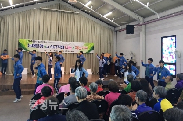 NH농협은행(은행장 이경섭)은 상반기에 채용되어 농협 청주교원에서 연수중인 6급 신입행원들이 14일 충남 공주에 위치한 사회복지시설인 명주원을 찾아 '나눔&재능기부' 활동을 펼쳤다.