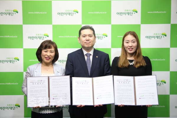 한화갤러리아타임월드 신동일 점장(가운데), 대전광역시치어리딩협회 임한나 회장(우측), 초록우산어린이재단 대전지역본부 박미애 본부장(좌측)이 “희망트레이너, 꿈꾸는 날갯짓” 협약서 서명 후 단체사진을 촬영하고 있다.