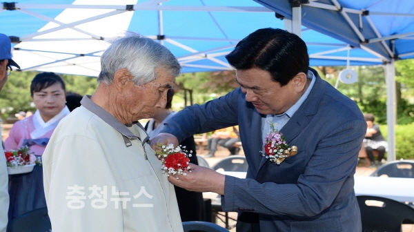 지난 12일 계룡면 경로잔치에서 오시덕 공주시장이 어르신께 카네이션을 달아드리는 모습