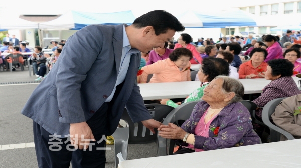 지난 12일 의당면 경로잔치에서 오시덕 공주시장이 어르신의 손을 잡아드리는 모습