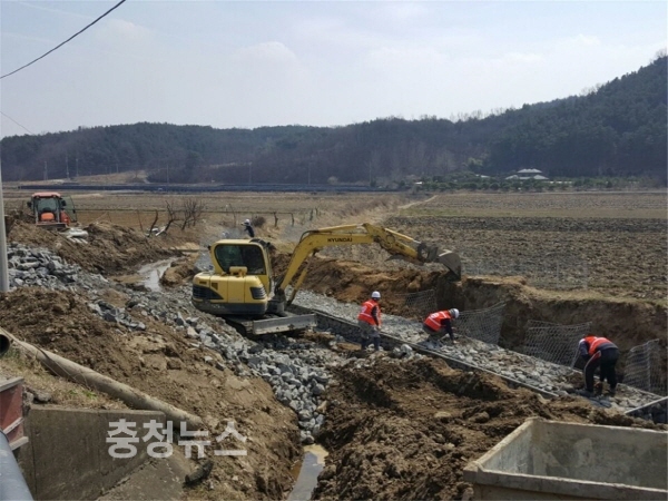 농촌생산기반 조성을 위해 기계화 경작로 및 농작로 포장, 편안한 물길 조성 및 용배수로를 정비하고 있다.