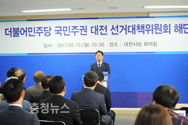 박범계 선대위원장은 15일 더불어민주당 선거대책위원회 해단식에서 “호남과 제주도를 제외하고 가장 많이 투표한 곳이 대전”이라며 "대전의 높은 투표율이 문재인을 대통령으로 만들었다"고 말했다.