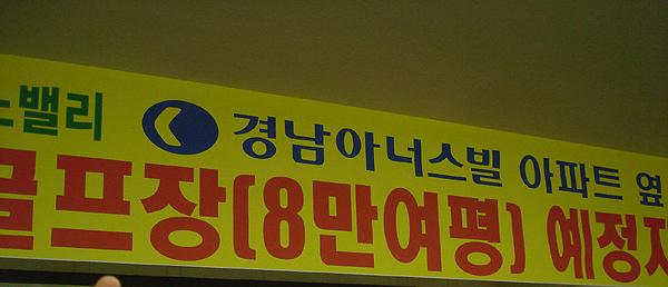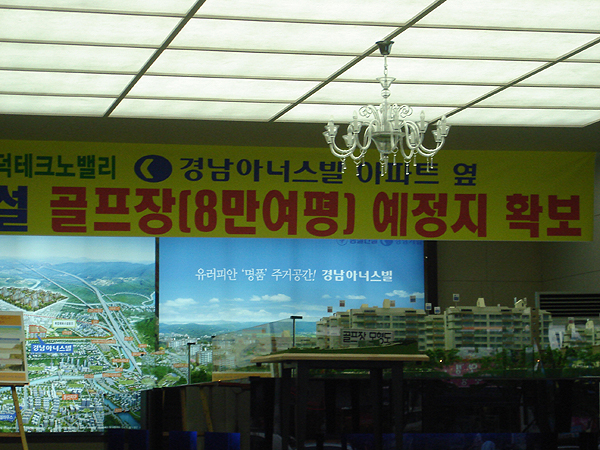 금실건설(대표 정영숙)은 유성구 대덕테크노밸리 내 용산동 A-3-1-1블럭에 건립중인 아파트 315세대를 분양하면서 아파트 단지 옆에 확보한 부지를 8만여평에 달하는 골프장 예정지를 확보했다고 분양광고를 하고 있다.