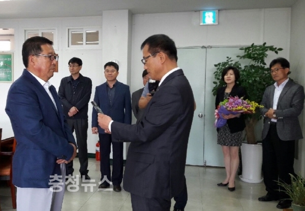윤영득 부의장 이현구 지사장으로 부터 정승 한국농어촌공사 사장의 감사패를 전달 받고 있다.