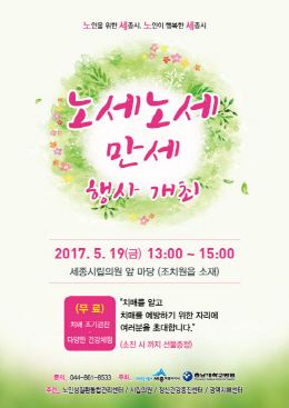세종시 노인성질환통합관리센터가 개소 1주년을 맞아 오는 19일 조치원읍 소재 세종시립의원 앞마당에서 ‘2017 노세노세! 만세!’ 행사를 개최한다고 17일 밝혔다.