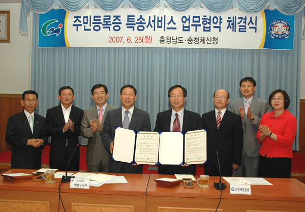충청남도와 충청체신청은 6월 25일 도청 대회의실에서 ‘주민등록증 특별송달서비스’ 협약을 체결하고, 오는 7월부터 발급되는 주민등록증을 희망하는 주소지에서 받아 보는 ‘우체국 특별송달 서비스’를 시행 한다고 밝혔다.