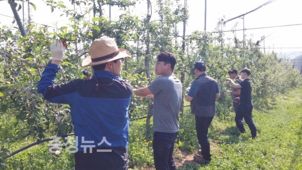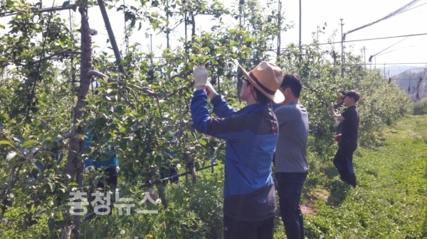 이날 면 직원 10여명은 바쁜 업무를 잠시 접어두고 이른 아침부터 관내 과수농가를 방문해 농가의 부담이 없도록 식사와 작업준비물도 직접 준비한 가운데 사과나무 200여주에 대한 적과작업을 실시했다.