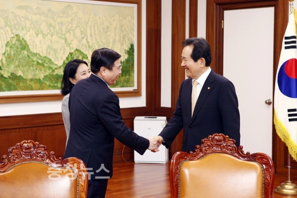 응웬 타인 펑(왼쪽)과 정세균 의장(오른쪽)이 악수를 하고 있다.