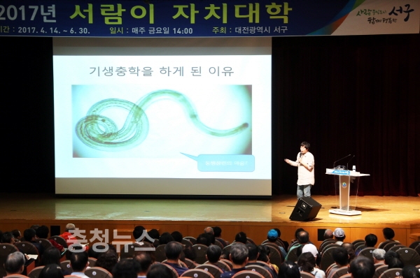 지난 19일 구청 대강당에서 열린 서람이 자치대학 제4강은 기생충 전문가 서민 단국대 교수가 강사로 나서 ‘기생충과 인간’을 주제로 주민들께 재미와 감동을 선사했다.