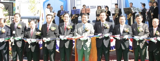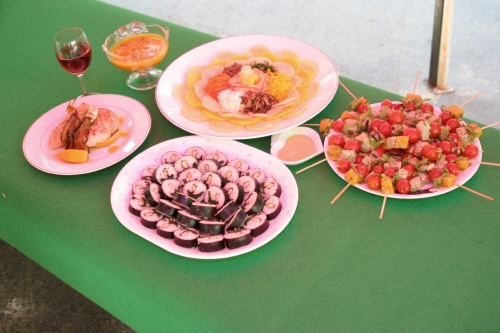 행사장내 음식자랑 전시코너에 많은 사람들이 모여 시식을 했으며 "여기 옆집 식당에서 제공하는 고기에요"라고 한 아주머니의 음식점 외침이