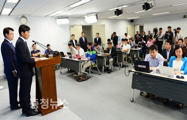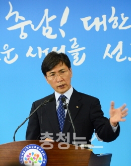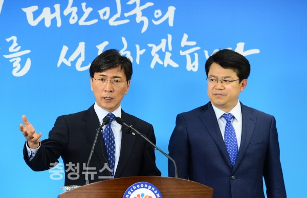 안희정 충남지사는 22일 도청 브리핑실에서 복기왕 아산시장과 함께 갑을오토텍과 유성기업 노사분쟁의 조속하고 평화로운 해결을 촉구하는 공동제안을 발표했다.