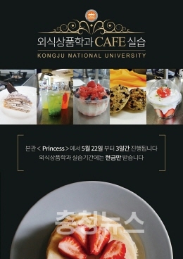 충남 공주대학교(총장직무대리 김희수) 산업과학대학 식품과학부 외식상품학전공 학생들은 학교기업 프린세스와 연계로 오는  22일부터 24일까지 3일간 산업과학대학 프린세스에서 교과형 현장실습 카페(CAFE)교육을 실시한다고 22일 밝혔다.