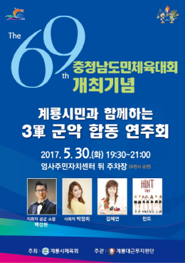 계룡시체육회가 주최하고 계룡대근무지원단 주관으로 열리는 이번 연주회는 ‘제69회 충청남도민체육대회’ 개최를 기념하여 시민의 화합과 소통의 장을 마련하고자 준비됐다.