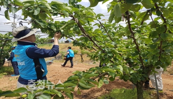 이번 활동은 공사 임직원 40명이 인력이 부족한 농가를 찾아 배나무 영양제 주사, 배 꽃따기 등을 하며 일손을 도왔다.
