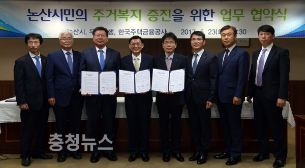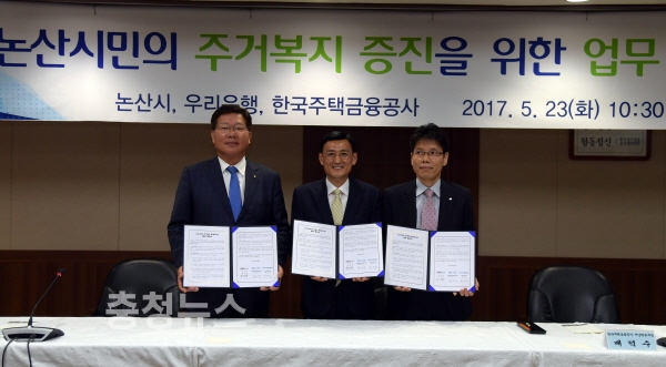충남 논산시(시장 황명선)는 한국주택금융공사, 우리은행과 지난 23일 상황실에서‘논산시민의 주거복지 증진을 위한 업무협약’을 체결했다.