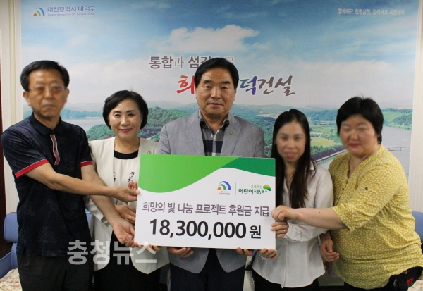 초록우산 어린이재단 대전종합사회복지관(관장 유미)은 지난 23일 대덕구청(구청장 박수범)에서 대덕구 내 거주하고 있는 3가정에게 박정윤 후원자 지원-희망의 빛 나눔 프로젝트 후원금 총 1,830만원을 전달하였다.