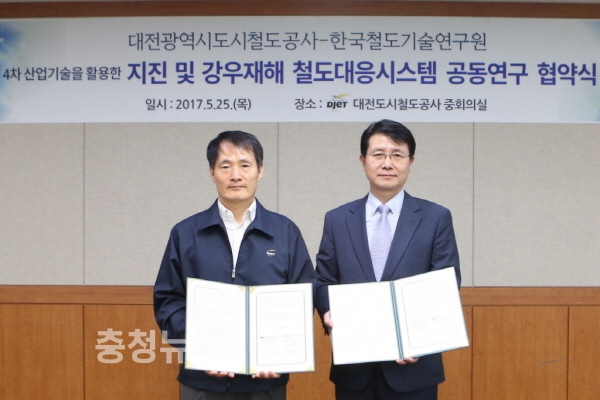 대전도시철도공사(사장 김민기)는 25일 한국철도기술연구원(원장 김기환)과 ‘지진 및 강우 재해에 대한 철도 대응시스템 기술 협력 협약’을 체결했다.