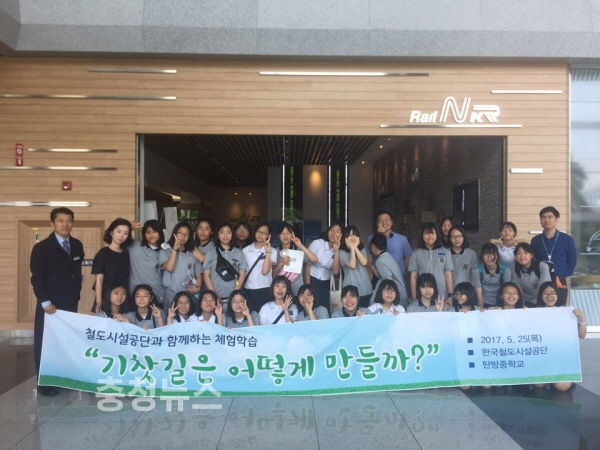 한국철도시설공단(이사장 강영일)이 학생들에게 폭넓은 학습경험을 제공하기 위하여 25일 대전 탄방중학교 학생들을 대상으로 철도건설을 주제로 하는 ‘자유학기제 진로체험행사’를 시행했다고 밝혔다.