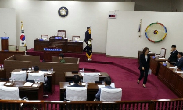 의회는 25일 다수의 의원들이 의장-부의장 선출 요구의 건으로 임시회를 열었지만 김영미 임시의장은 현재 의회상황으로 볼 때 성립요건이 되지 않는다며 곧바로 산회를 선포했다.