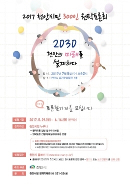 충남 천안시는 시민 대상 ‘300인 원탁토론회’를 오는 7월 5일에 개최하기로 한 가운데 참가자 300명을 다음달 16일까지 선착순 모집한다.