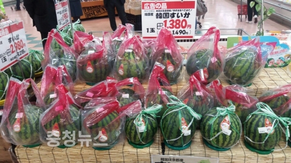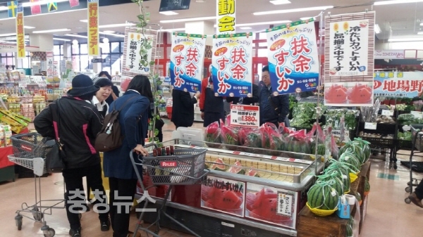 충남 부여군 굿뜨래 수박이 일본 북해도에서 지난 25~28일까지 4일간 북해도내 마트 10개소에서 홍보 판촉행사를 개최했다.
