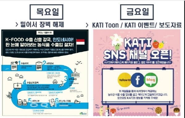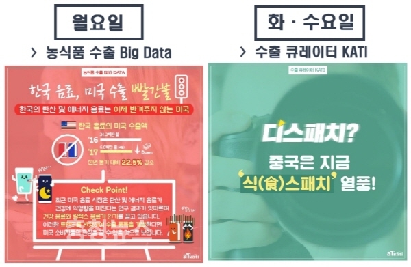 특히 요일별로 카테고리를 나누어, 월요일에는 농식품 수출통계로 본 수출 BIG DATA, 화·수요일엔 해외시장 최신이슈와 식품트렌드, 목요일엔 비관세장벽과 식품관련 인증, 그리고 수출과 관련된 법과 제도 등을 주기적으로 제공한다.