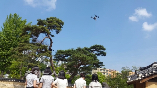 드론으로 대덕 회덕향교 촬영중인 학생들 모습