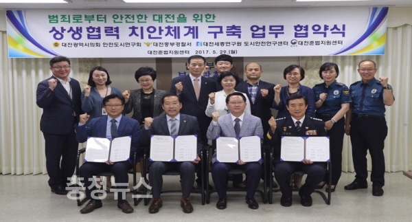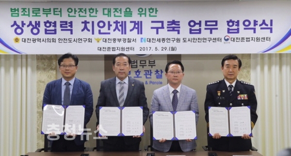 이에 29일 대전보호관찰소에서는 대전광역시 의회 안전도시연구회와 대전보호관찰소, 대전세종연구원 도시안전연구센터, 중부경찰서는 범죄로부터 안전한 대전 만들기를 위하여 지역사회 안전망 조성과 CPTED 교육 등 협력치안 체계 구축에 공동 노력하기로 하고 협약을 체결하였다.