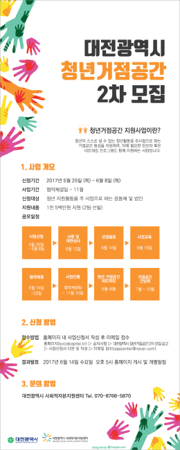 대전광역시(시장 권선택)는 청년들이 자유롭고 안정적으로 이용할 수 있는 공간 조성을 지원함으로써 청년들의 설자리를 마련하기 위한「2017년 청년 거점공
