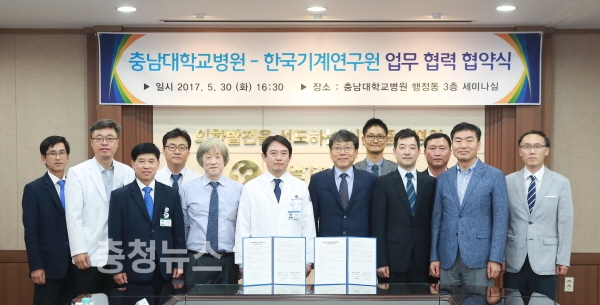 충남대학교병원(원장 송민호)은 30일 충남대학교병원 행정동 3층 세미나실에서 한국기계연구원(원장 박천홍)과 연구협력 기술교류 협약을 체결했다.