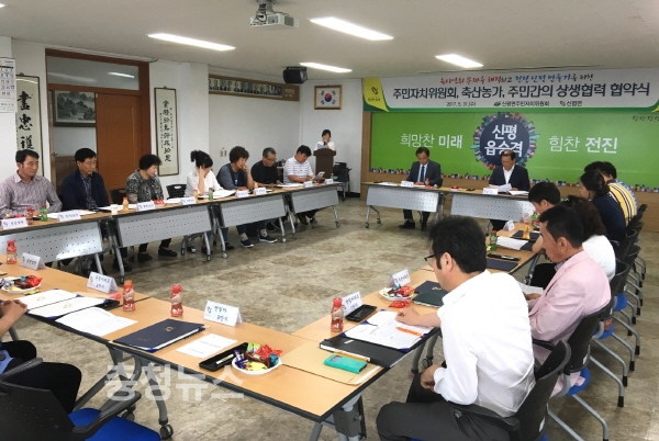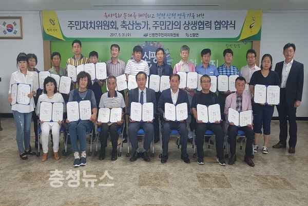 주민자치위원회의 이러한 노력으로 지난 5월 31일 축산농가 대표와 아파트 주민들은 신평면사무소에 모여 주민자치위원회와 함께 상생 협약을 체결해 갈등 해결을 풀 수 있는 물꼬를 틀 수 있었다.