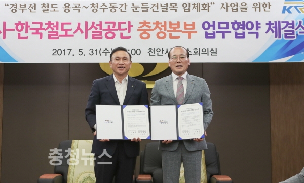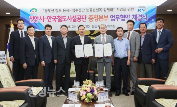 충남 천안시와 한국철도시설공단 충청본부는 31일 시청 소회의실에서 구본영 시장과 이동렬 충청본부 본부장 등이 참석한 가운데 ‘경부선철도 용곡~청수동간 눈들건널목 입체화사업’ 업무 협약을 체결했다.
