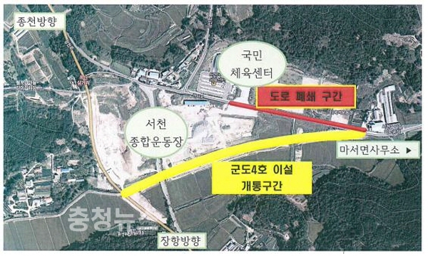 군도4호선에 투입한 공사비는 20억원으로 전체연장 784m, 폭원 9~25m이며, 2~6차로로써 마서면 월포리에서 지방도 617호와 교차하면서 국민체육센터앞으로 통행하던 기존의 군도4호는 서천종합운동장 단지내 도로로 활용하면서 폐쇄한다.