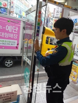대전둔산경찰서 생활안전계(계장 박성호)는 관내 편의점 00곳에 방문해, CCTV와 비상벨 작동 여부를 점검하고, 매장 출입문에 강력범죄 예방을 위한 키 측정 스티커를 부착했다.
