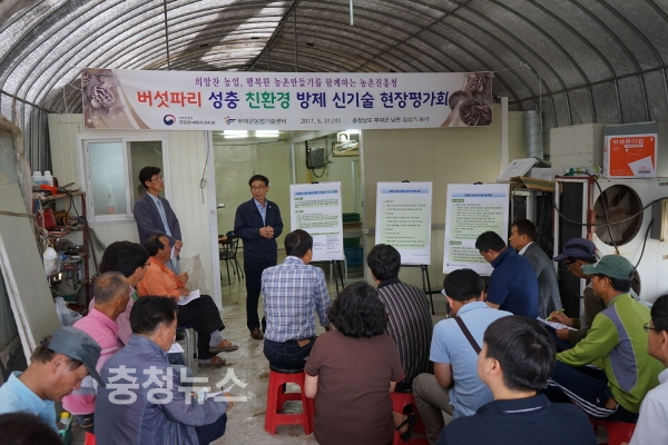 충남 부여군농업기술센터(소장 최석우)는 지난 달 31일 남면 신홍리 버섯 농가 재배사에서 ‘버섯파리 성충 친환경 방제용 천연 살충제 달마시안제충국 가열 연무’ 신기술 현장실증시험에 대한 현장평가회를 국립원예특작과학원과 공동 개최했다.