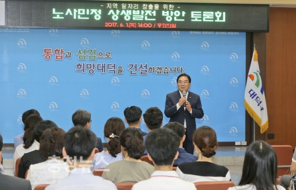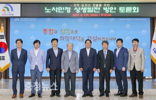 대전 대덕구(구청장 박수범)는 1일 구청 중회의실에서 4차 산업혁명에 따른 고용안정과지역 경제발전과 일자리 창출, 건전한 노사관계 상생 발전을 위해 어떤 역할들이 필요한 지 고민하고자 대덕구 노사민정협의회(위원장 박수범) 토론회를 열어 열띤 소통의 자리를 가졌다.