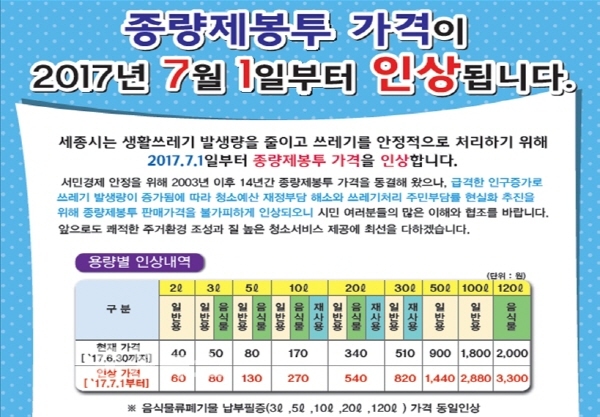 시 청결과 관계자는 4일 “세종시의 청소예산 재정자립도 및 주민 부담율이 17개 광역시·도 중 가장 낮은 수준”이라며 “이번 가격 인상은 배출자 부담원칙에 입각한 쓰레기 종량제 시행 취지에 따른 것으로 이해와 협조를 부탁드린다”고 말했다.