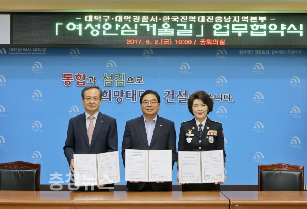난 2일 대덕구청 중회의실에서 박수범 대덕구청장(가운데)은 최익수 한국전력대전충남지역본부장(왼쪽), 송정애 대덕경찰서장(오른쪽)과 여성안심거울길 조성 업무협약식을 갖고 기념촬영
