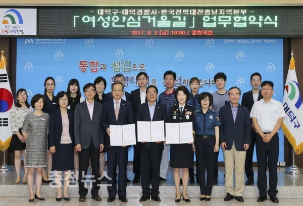 지난 2일 구청 중회의실에서 대덕경찰서(서장 송정애), 한국전력대전충남지역본부(본부장 최익수)와 업무협약을 맺고 중리동 용전중학교 일대 전신주에는 안심거울설치와 공동주택 현관에는 미러시트를 부착하기로 했다.