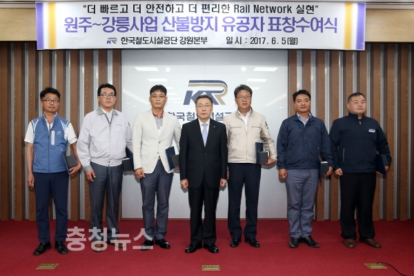한국철도시설공단 강영일 이사장은 지난달 6일 강릉지역에서 발생한 대형 산불을 조기에 진화하여 원주∼강릉철도 시설물 보호에 기여한 현장 유공자에게 5일 표창을 수여하였다.