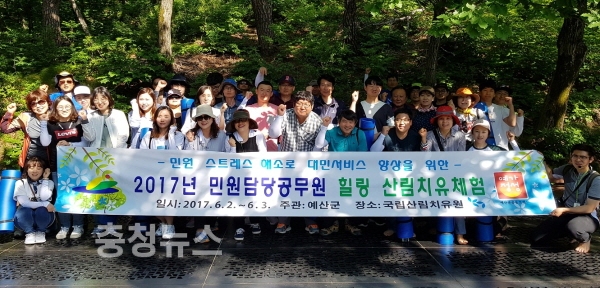 충남 예산군은 민원담당 공무원 36명을 대상으로 스트레스 해소와 사기진작을 위해 지난 2일부터 3일까지 경북 영주시 국립산림치유원에서 ‘힐링 산림치유체험 프로그램’을 실시했다고 밝혔다.